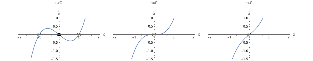 ploptions={AxesLabel{Style["x",14],Style["",14]},AxesOrigin{0,0},PlotRange{-1.5,1},AspectRatio0.5};pla=Show[Plot[-x+,{x,-2,2},Evaluate[ploptions]],Graphics[Arrow[#]]&/@{{{-1.25,0},{-1.8,0}},{{-0.8,0},{-0.25,0}},{{0.8,0},{0.25,0}},{{1.25,0},{1.8,0}}},Graphics[Disk[{0,0},0.1]],Graphics[Circle[{1,0},0.1]],Graphics[Circle[{-1,0},0.1]],PlotLabelStyle["r<0",14]];plb=Show[Plot[,{x,-2,2},Evaluate[ploptions]],Graphics[Arrow[#]]&/@{{{-0.25,0},{-0.8,0}},{{0.25,0},{0.8,0}}},Graphics[Circle[{0,0},0.1]],AxesOrigin{0,0},PlotLabelStyle["r=0",14]];plc=Show[Plot[x+,{x,-2,2},Evaluate[ploptions]],Graphics[Arrow[#]]&/@{{{-0.25,0},{-0.8,0}},{{0.25,0},{0.8,0}}},Graphics[Circle[{0,0},0.1]],PlotLabelStyle["r>0",14]];GraphicsGrid[{{pla,plb,plc}},ImageSize1000,Spacings-80]