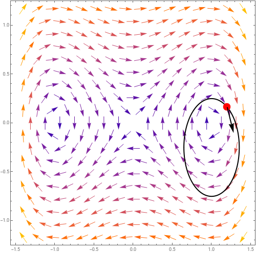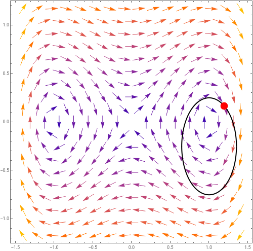4) What if we are on a curve which is some closed orbit, ie. a trajectory of the system? In that case the vector field follows along the curve precisely (it’s always a tangent to the curve) and so as we go around once, the vector must rotate once, so the index of a closed orbit will always be 1.