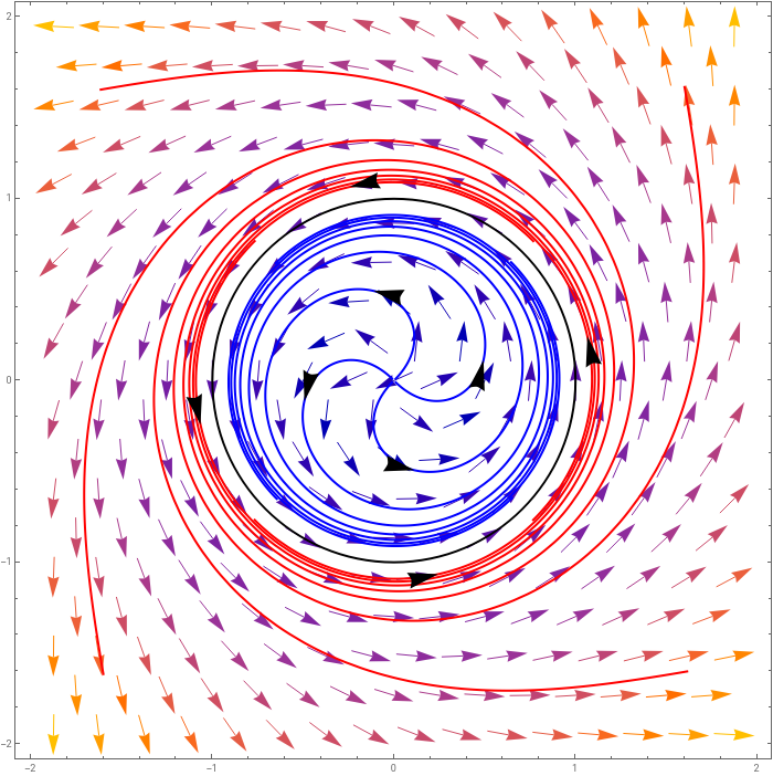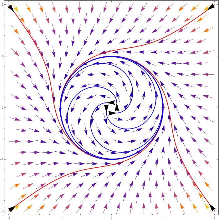 eqns=SimplifySolveD+,t==,DArcTan,t==1,{x'[t],y'[t]}[[1]];startpoints=FlattenPermutations[{1,1,-1,-1},{2}]#&/@+0.06,0.01,1;({x[t],y[t]}/.NDSolve[{x'[t]==(x'[t]/.eqns),y'[t]==(y'[t]/.eqns),x[0]==#[[1]],y[0]==#[[2]]},{x,y},{t,0,11}][[1]])&/@startpoints;Show[VectorPlot[Evaluate[{x'[t],y'[t]}/.eqns/.{x[t]->x,y[t]->y}],{x,-2,2},{y,-2,2}],ParametricPlot[%,{t,0,11},PlotStyle->{{Red,Thick},{Red,Thick},{Red,Thick},{Red,Thick},{Blue,Thick},{Blue,Thick},{Blue,Thick},{Blue,Thick}}],Graphics[Arrow[{#/.t->1,#/.t->1.01}]]&/@%,Graphics[{Thick,Circle[{0,0},1]}],ImageSize->700]