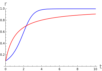 stable=r[t]/.DSolver'[t]==r[t](1-),r[0]==,r,t[[1]]semistable=r[t]/.DSolver'[t]==,r[0]==,r,t[[1]]Plot[{stable,semistable},{t,0,10},PlotRange->{0,1},PlotStyle->{Blue,Red},AxesLabel->Evaluate[Style[#,20]&/@{"t","r"}],PlotLegends{"stable example","semi-stable example"}]