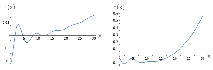 f[x_]=+0.0001-0.01;F[x_]=Integrate[f[u],{u,0,x}];GraphicsGrid[{{Plot[f[x],{x,0,30},AxesLabel->Evaluate[Style[#,20]&/@{"x","f(x)"}]],Plot[F[x],{x,0,30},AxesLabel->Evaluate[Style[#,20]&/@{"x","F(x)"}]]}},ImageSize->700]