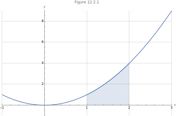 Show[Plot[,{x,-1,3},PlotRange->{{-1,3},{-1,9}},PlotLabel->"Figure 12.2.1",AxesLabel->{"x","y"},GridLines->Automatic,ImageSize->Large],Plot[,{x,1,2},Filling->Axis,PlotRange->{{1,2},{-1,9}}]]