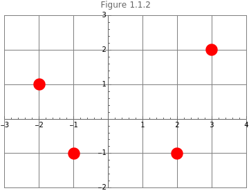 (*PlottingthefourpointsusingtheGraphicsfunction*)Graphics[{PointSize[0.05],Red,Point[{,,,}]},AxesTrue,PlotLabel"Figure 1.1.2",ImageSizeMedium,PlotRange->{{-3,4},{-2,3}},GridLines->Automatic]