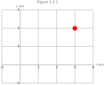 Graphics[{PointSize[0.05],Red,Point[{3,2}]},AxesTrue,AxesLabel{"x axis","y axis"},PlotLabel"Figure 1.2.1",ImageSizeMedium,GridLines->Automatic,PlotRange->{{-1,4},{-1,3}}]
