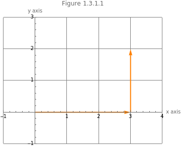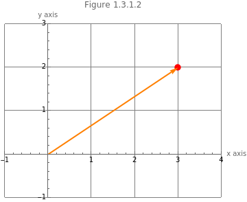 Graphics[{{PointSize[0.03],Red,Point[{3,2}]},Orange,Thick,Arrow[{{0,0},{3,2}}]},AxesTrue,AxesLabel{"x axis","y axis"},PlotLabel"Figure 1.3.1.2",ImageSizeMedium,GridLines->Automatic,PlotRange->{{-1,4},{-1,3}}]