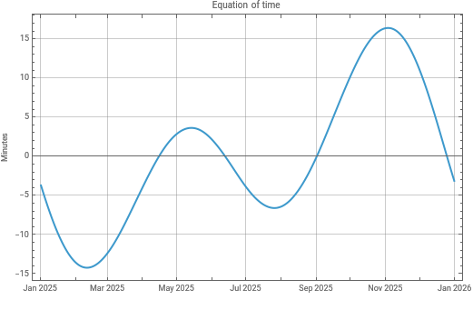DateListPlot[Transpose[{noon,offset}],Axes->True,GridLines->Automatic,PlotLabel->"Equation of time",FrameLabel->{"","Minutes"}]