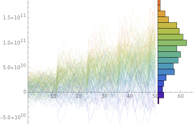 rfproc=RandomFunction[proc,{50},200];sd=rfproc["SliceData",50];cf=ColorData["Rainbow"];sliced=BarChart[Last[#],AxesFalse,BarOriginLeft,AspectRatio4,ChartStyle(cf/@Rescale[MovingAverage[First[#],2],{Min[sd],Max[sd]},{0,1}]),ImageSize65]&[HistogramList[sd,{Range[Min[sd],Max[sd],(Max[sd]-Min[sd])/20]}]];ListLinePlot[rfproc,ImageSize400,PlotRangeAll,AspectRatio3/4,EpilogInset[sliced,{51,0},{0,2.5}],PlotStyle(cf/@Rescale[sd]),BaseStyleDirective[Thin,Opacity[0.5]],PlotRangePadding{{0,15},{.5,.5}}]