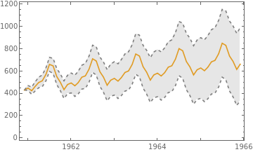 k=5;start="December 1st, 1960";forecastDates=DateRange[start,DatePlus[start,{k,"Year"}],"Month"];forecast=tsm/@forecastDates;bands=tsm["PredictionLimits"][#]&/@forecastDates;pforecast=DateListPlot[{bands[[All,1]],forecast,bands[[All,2]]},{start,Automatic,"Month"},JoinedTrue,Filling{1{3}},PlotStyle{Directive[{Dashed,Gray}],Automatic,Directive[{Dashed,Gray}]}]