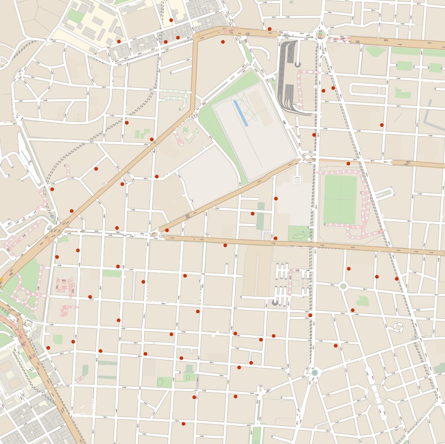 Location of pharmacies in a part of Madrid city:
