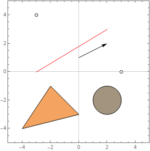 Draw2D{(*Drawseveralwhitepoints*)CirclePoint[★+3,3,Black,White],CirclePoint[★-3+4,3,Black,White],(*Drawaredline*){Red,Line[{★-3,★+2+3}]},(*DrawanArrow*)Arrow[{★+,★+2+2}],(*Drawacoloredtriangle*),FaceForm[ColorData["Legacy"]["SandyBrown"]],EdgeForm[Black],Polygon[{★-4-4,★-2-,★-3}],(*DrawanoutlinedDisk*)FaceForm[ColorData["Legacy"]["Beige"]],Disk[★+2-2,1]}//