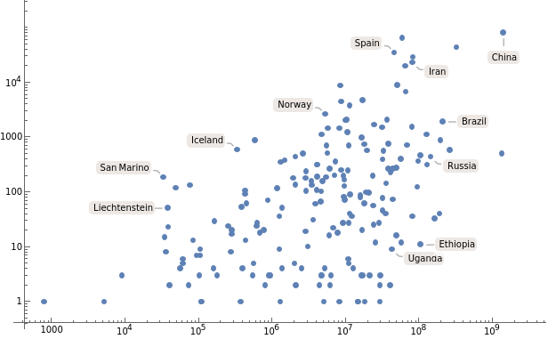 Make a log-log plot of the latest reported number of cases as a function of population: