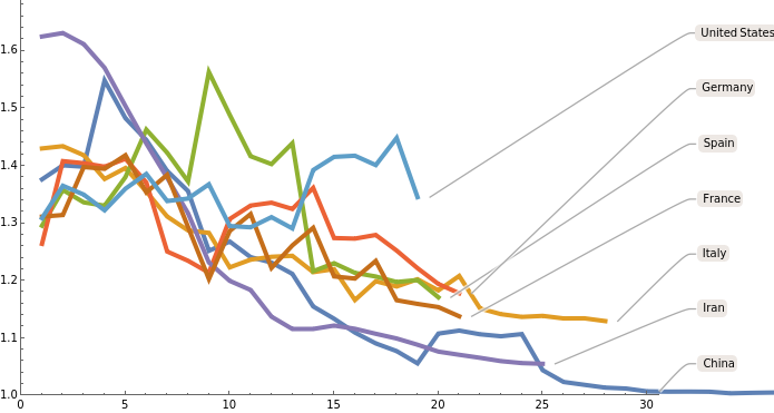 ListLinePlot[KeyValueMap[Callout[#2,#1]&,DeleteCases[MeanFilter[Ratios[#],2]&/@Select[GreaterThan[100]]/@N@Select[countryValues,Max[#]>10000&],{}]],PlotRange{{0,30},{1,All}},PlotStyleThickness[0.007]]