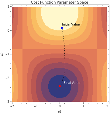When the cost function is relatively simple and can be expressed symbolically, the ContourPlot can exhibit repetitive patterns. This repetition often results from the periodic nature of trigonometric functions (e.g., sinand cos) that may appear in the cost function due to the rotation gates used in the ansatz.