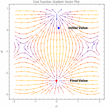 The stream plot of the gradient of our cost function can provide insight into the behavior of the evolution as observed in its parameter space: