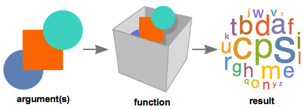 All calculations in Mathematica are done by calling functions.You can think of each function as a box. Into each box we put arguments, and then the box spits out a result.