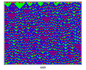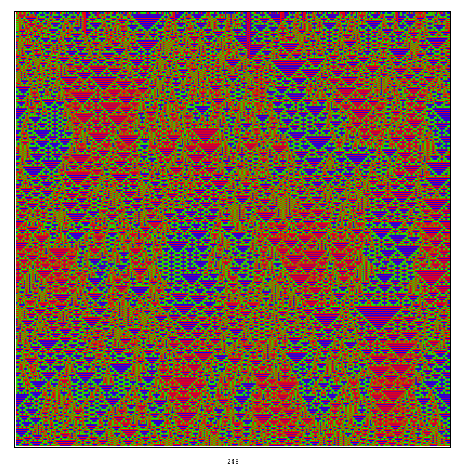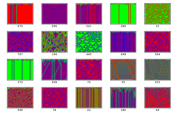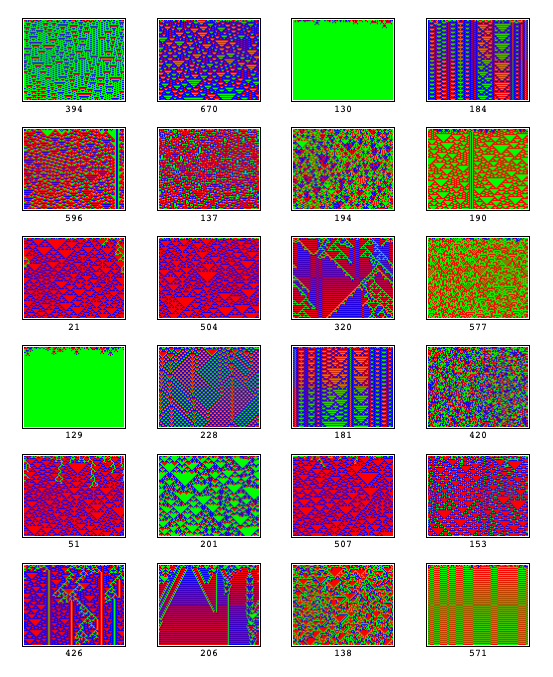 r3pix[rn_, size_] := LabelWrapper[XCAGraphics[XCAEvolveList[ TotalisticRule[rn, 3, 1], RandomList[size, 3], size], Colors->{Red,Green,Blue}], BigFont[rn]]