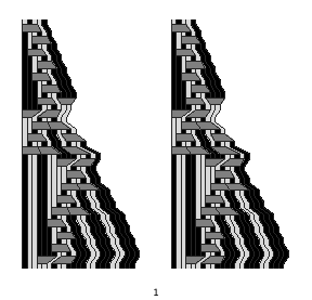MapIndexed[Show[LabelWrapper[GraphicsRow[{SMWXGraphicsStreamed[SMWEvolveListX[#,"ABAAB",20]],SMWXGraphicsStreamed[SMWEvolveListX[#,"ABAAB",20,Backward]]}],BigFont[First[#2]]]]&,%];