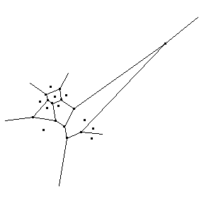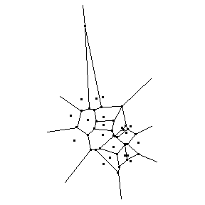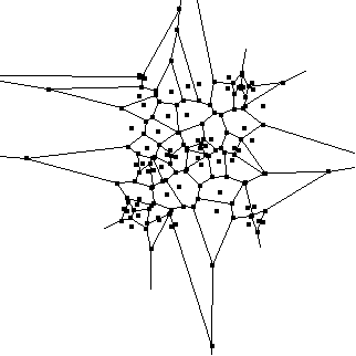 RandomVoronoi[n_]:=Module[{pts},pts=Table[Random[],{n},{2}];DiagramPlot[pts,First[#],Last[#],LabelPoints->False,TrimPoints->4]&[VoronoiDiagram[pts]]]