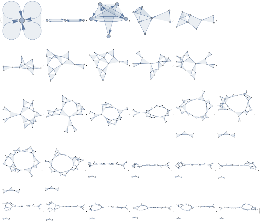 HypergraphPlot/@WolframModel[{{1,2,3},{1,4,5}}{{3,6,4},{4,7,2},{2,6,1}},{{0,0,0},{0,0,0}},30,"StatesList"]