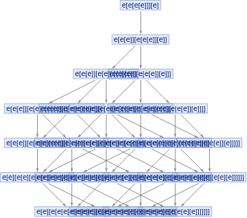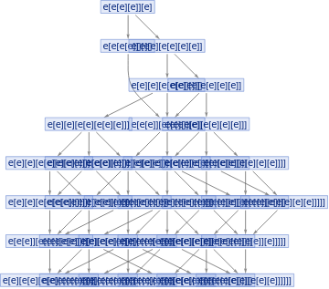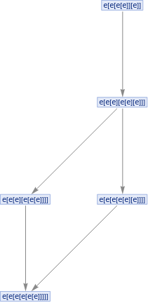 ResourceFunction["MultiwayCombinator"][e[x_][y_]->x[x[y]],#,6,"StatesGraph"]&/@Groupings[Table[e,5],Construct->2]