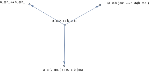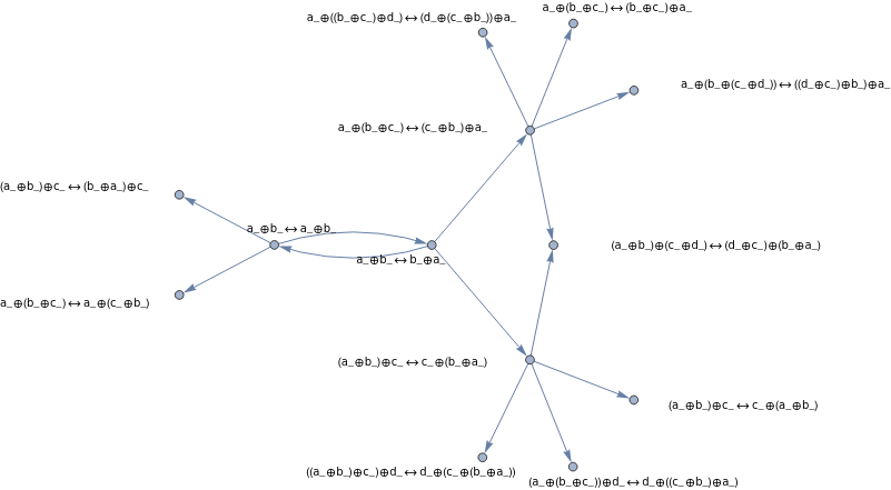 NestGraph[Flatten[{Values[coSubstitutionLemmas[#,x_⊕y_y_⊕x_,"Canonicalize"->True]]}]&,a_⊕b_b_⊕a_,4,GraphLayout->"SpringElectricalEmbedding",VertexLabels->Placed["Name",Tooltip]]