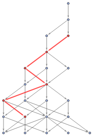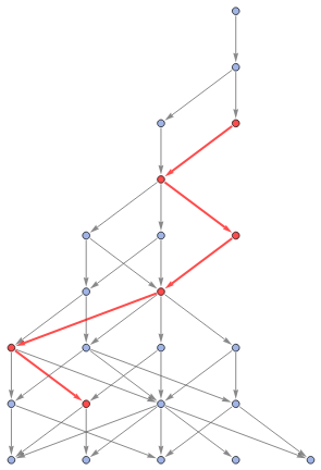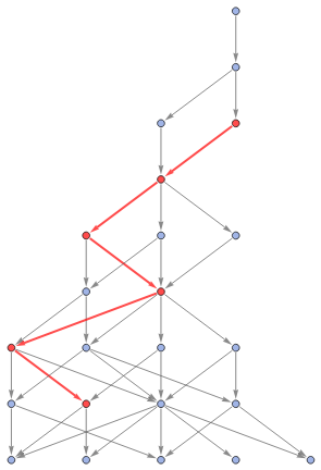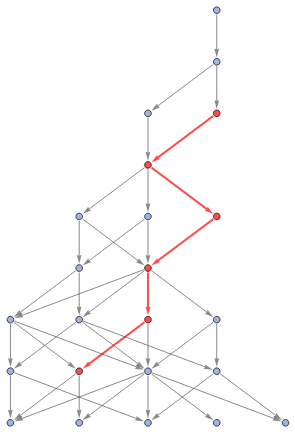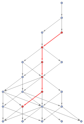 With[{g=Graph[ResourceFunction["MultiwaySystem"][{"A"->"BBB","BB"->"A"},"A",8,"StatesGraph"],AspectRatio->1.5]},HighlightGraph[g,Style[PathGraph[FindShortestPath[g,"BA","AAB"],DirectedEdgesTrue],Red,Thick]]]
