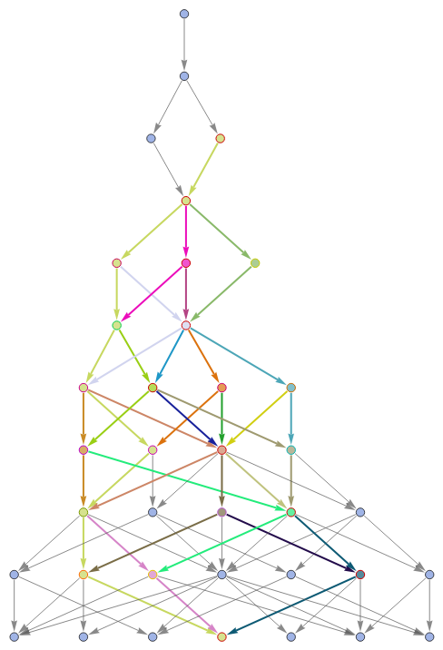 With[{g=Graph[ResourceFunction["MultiwaySystem"][{"A"->"BBB","BB"->"A"},"A",8,"StatesGraphStructure"],AspectRatio->1.5]},HighlightGraph[g,Style[PathGraph[#,DirectedEdgesTrue],RandomColor[],Thick]&/@FindPath[g,"BA","AAB",All,All]]]
