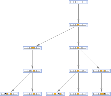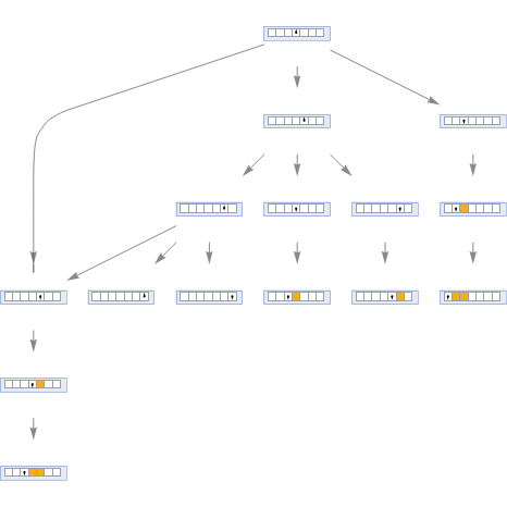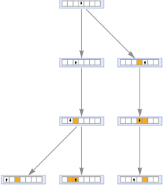 With[{t=7},MultiwayTuringMachine[#,{{1,t+1,0},Table[0,2t+1]},t,"StatesGraph",VertexSize.8{1,.2},GraphLayout"LayeredDigraphEmbedding",PerformanceGoal"Quality"]]&/@{{{{1,1}{2,0,-1}},{{1,0}{2,1,1}},{{2,1}{1,0,1}},{{2,0}{1,1,-1}},{{2,0}{1,0,1}}},{{{1,1}{2,0,-1}},{{1,0}{2,1,1}},{{2,1}{1,0,1}},{{2,0}{1,1,-1}},{{1,0}{2,0,-1}}}}