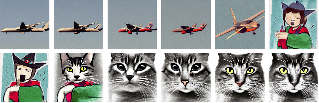 With[{other=NetModel[{"CLIP Multi-domain Feature Extractor","InputDomain"->"Text","Architecture"->"ViT-L/14"}]["An airplane",NetPort[{"post_normalize","Output"}]]},GraphicsGrid[Partition[StableDiffusionSynthesize[Table[xcat+(1-x)other->BlockRandom[SeedRandom[254345];RandomVariate[NormalDistribution[],{4,64,64}]],{x,0,1,1/11}]],6]]]