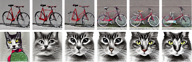 GraphicsGrid[Partition[StableDiffusionSynthesize[Table[xcat+(1-x)bicycle->BlockRandom[SeedRandom[254345];RandomVariate[NormalDistribution[],{4,64,64}]],{x,0,1,1/11}]],6]]