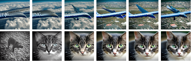 With[{other=NetModel[{"CLIP Multi-domain Feature Extractor","InputDomain"->"Text","Architecture"->"ViT-L/14"}]["A airplane",NetPort[{"post_normalize","Output"}]]},GraphicsGrid[Partition[StableDiffusionSynthesize[Table[xcat+(1-x)other->BlockRandom[SeedRandom[254345];RandomVariate[NormalDistribution[],{4,64,64}]],{x,0,1,1/11}]],6]]]