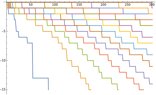 data=ParallelTable[SeedRandom[2524+i];DeathLossFunction[#,200]&/@NestList[First[MinimalBy[Append[Table[CARuleMutation[#],1],#],DeathLossFunction[#,200]&]]&,{0,3,1},300],{i,500}];