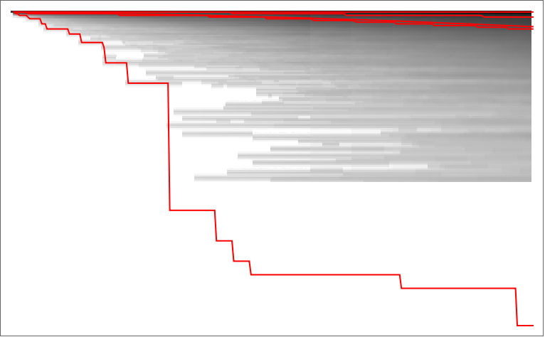Show[ArrayPlot[Reverse[Transpose[With[{d=SmoothKernelDistribution[#]},Table[PDF[d,x]/PDF[d,Median[d]],{x,-100,0,1}]]&/@Transpose[data5000]]],AspectRatio->1/GoldenRatio,ColorFunction->(GrayLevel[1-#^.2]&),DataRange->{{0,300},{-100,0}}],ListLinePlot[Mean/@Transpose[data5000],PlotStyle->Red],ListLinePlot[Min/@Transpose[data5000],PlotStyle->Red],ListLinePlot[Transpose[Quartiles/@Transpose[data5000]],PlotStyle->Red]]