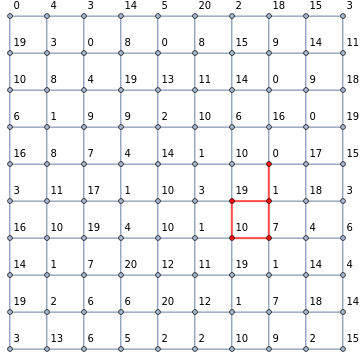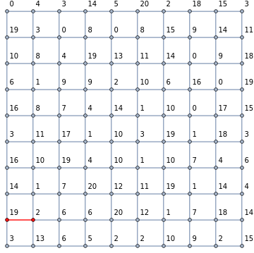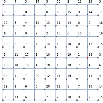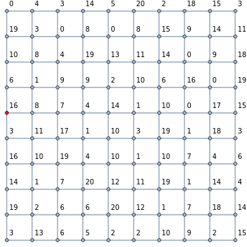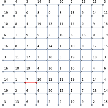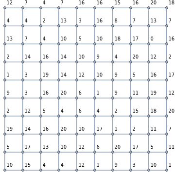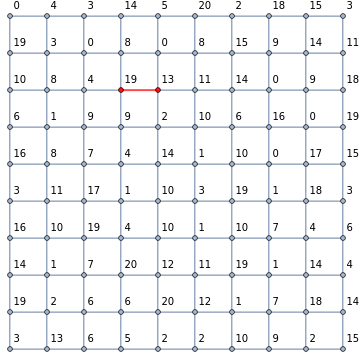 GridGraph[{10,10},VertexLabels->{x_:>RandomInteger[20]}]