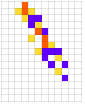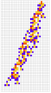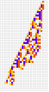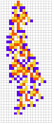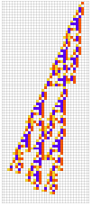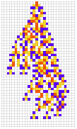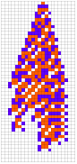Module[{goal=50,deep=5000,cut=200,ru,life,evo,data},SeedRandom[426779];evo=NestList[CompoundExpression[ru=RandomRuleMutation[First[#]],life=TestLifetime[ru,cut],If[Abs[life-goal]<Abs[Last[#]-goal],{ru,life},#]]&,{{0,3,1},0},deep];evo=Rest[First/@SplitBy[evo,Last]];Map[CompoundExpression[data=CellularAutomaton[First[#],{{1},0},Last[#]+2],data=ArrayPad[#,2]&/@data,ArrayPlot[data,ColorRules->colors,ImageSize->{Automatic,26Sqrt[Length[data]+1]},Mesh->True,MeshStyle->Opacity[.1]]]&,evo]]