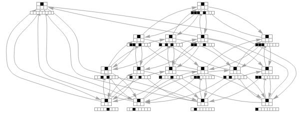 Module[{init={1},g0},g0=ResourceFunction["FixedPointGraph"][IterateMutations[1,GreaterEqual][#,init]&,{{{0,2,1},1}}];Graph[g0,GraphLayout->{"LayeredDigraphEmbedding","RootVertex"->{{0,2,1},1}},EdgeStyle->Gray,VertexShapeFunction->Function[Inset[ArrayPlot[CellularAutomaton[#2[[1]],Join[{0},init,{0}],#2[[2]]],Mesh->True,ImageSize->{Automatic,8(#2[[2]]+1)}],#1]],VertexLabels->{x_:>Placed[ArrayPlot[{IntegerDigits[x[[1,1]],2,8]},Mesh->True,ImageSize->50],Below]},PerformanceGoal->"Quality"]]