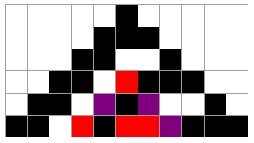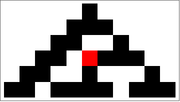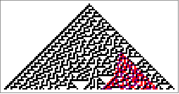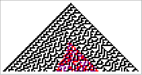 ArrayPlot[ReplacePart[CellularAutomaton[30,{{1},0},5],{4,6}->-1],ColorRules->{-1->Red}]