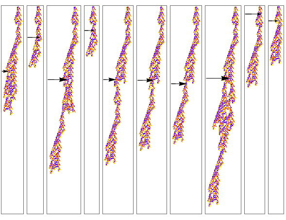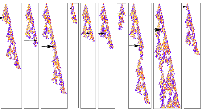 PlotCA[#]->GraphicsRow[Table[PlotCA@PerturbCA[{getca[#,300],#},"NRandom"->1],10]]&/@{{129394083852257874070100539595535549840,4,1},{144729370602329288854627065187434439480,4,1},{109151113611824779467688877590036116024,4,1},{319179722551268932850712554882090884748,4,1}}