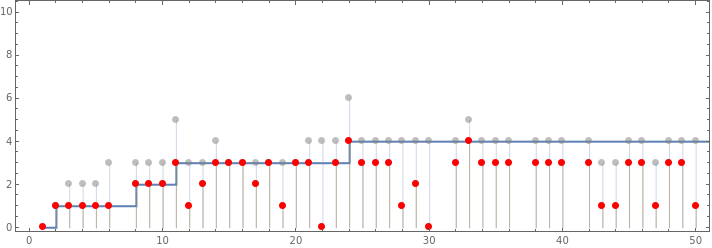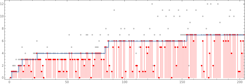 Show[ListPlot[Style[Catenate[MapIndexed[{First[#2],#1}&,rh[[All,3]],{2}]],Opacity[.5,Gray],PointSize[Medium]],PlotHighlighting->None],ListPlot[Style[MapIndexed[{First[#2],#}&,Min/@rh[[All,3]]],PointSize[Medium],Red],PlotHighlighting->None,Filling->Bottom,FillingStyle->Lighter[Red]],ListStepPlot[mh[[All,2]],PlotHighlighting->None],Frame->True,AspectRatio->1/3,PlotRange->{{0,200},{0,12}}]
