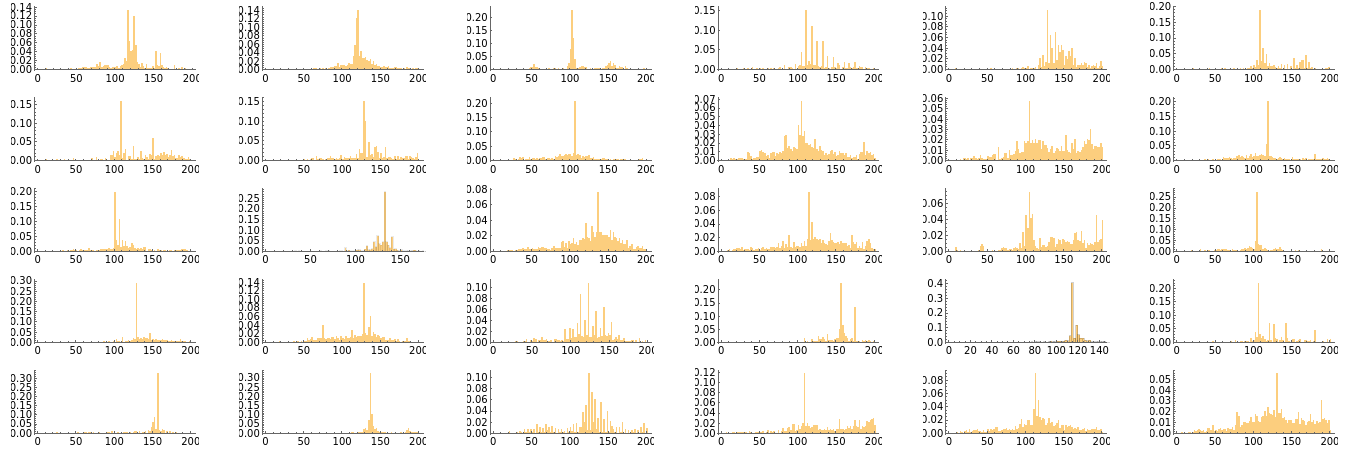 Histogram[#,100,"Probability",AspectRatio->.4]&/@ltscands//GraphicsGrid[Partition[#,6]]&