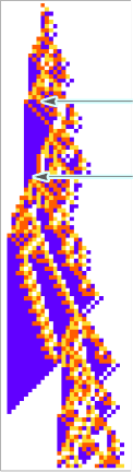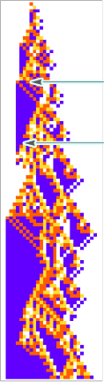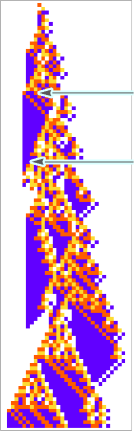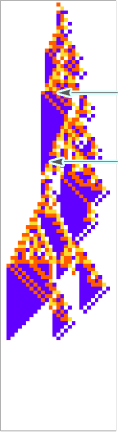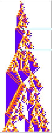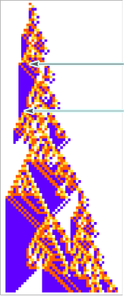 PlotCA[PerturbedCellularAutomaton[#,{{1},0},{110,{-110,110}},<|{23,111}->2,{41,109}->3|>]]&/@quickneutral[{299459058088077823758143088095350287424,4,1}]