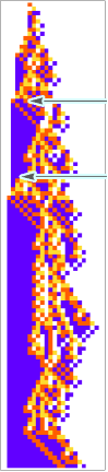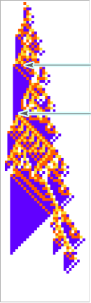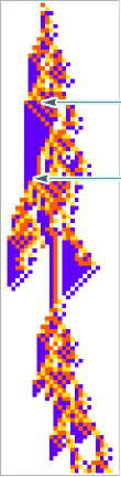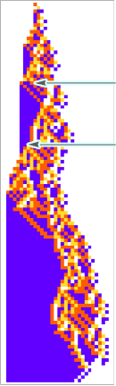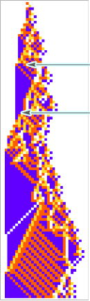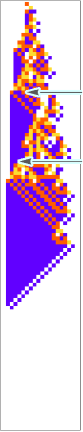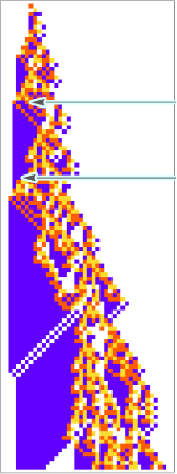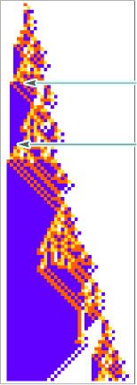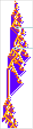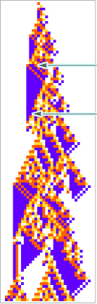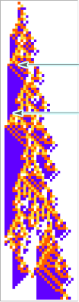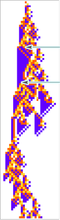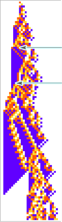 Style[Row[KeyValueMap[Labeled[#1,Text[Style[StringTemplate["(``)"][#2],Small]]]&,ReverseSort[Counts[PlotCA[PerturbedCellularAutomaton[#,{{1},0},{130,{-110,110}},<|{23,111}->2|>],"MaxWidth"->{100,130},"Trim"->{None,None},ImageSize->{Automatic,150},"Graphics"->firststepdiffarrow[#]]&/@quickneutral[{299459058088077823758143088095350287424,4,1}]]]],Spacer[4]],LineSpacing->{1,14}]
