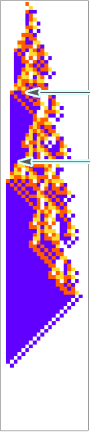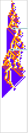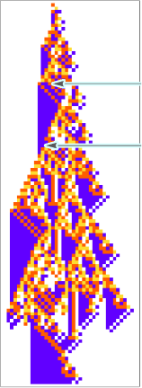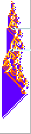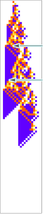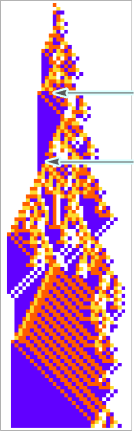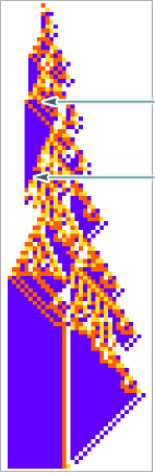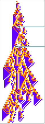 PlotCA[PerturbedCellularAutomaton[{299459058088077823758143088095350287424,4,1},{{1},0},{110,{-110,110}},<|{23,111}->2,{41,109}->3|>]]
