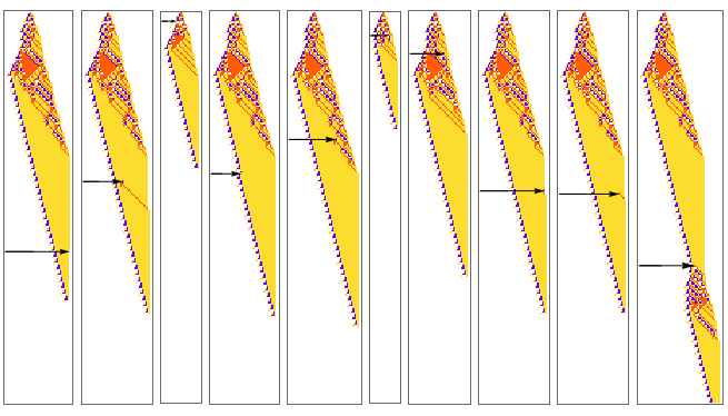 Table[SeedRandom[23535+i];PlotCA[PerturbCA[{getca[ru,250],ru}]],{i,10}]