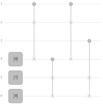 toffoli=QuantumCircuitOperator[{"0"->4,"1"->5,"0"->6,QuantumOperator["Fredkin",{1,2,4}],QuantumOperator["Fredkin",{4,5,6}],QuantumOperator["Fredkin",{1,2,4}],QuantumOperator["Fredkin",{3,5,6}]}];