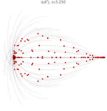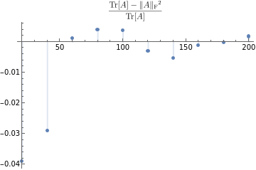 makeOperator[d0_]:=(d=d0;m=d;ii=IdentityMatrix[d];A=RandomVariate[NormalDistribution[],{m,d}];A=Normalize/@A;T=Fold[Function[{W,x},Table[w-x(w.x),{w,W}]],ii,A];evals=Eigenvalues[T];svals=SingularValueList[T];);Needs["MaTeX`"];spectralMoment[s_]:=Total[]/d;singularMoment[s_]:=Total[]/d;ff[k_]:=MaTeX[HoldForm[k]];SetAttributes[ff,HoldAll];makeOperator[100];Plot[{Total@Re[],Total[]},{s,1,10},AxesLabel->{"s"},PlotLegends->{ff[Sum[,i]],ff[Sum[,i]]},PlotLabel->"Sums of powers of eigenvalues and singular values of A"]makeOperator[20];plot1=Plot[Re[],{s,1,10},PlotStyle->Directive[Opacity[.5],Blue],PlotLegends->{ff[Re[]]}];plot2=Plot[,{s,1,10},PlotStyle->Directive[Opacity[.5],Red,Dashed],PlotLegends->{ff[]}];Show[plot1,plot2,AxesLabel->{"s"},PlotLabel->"Powers of eigenvalues and singular values of A"]