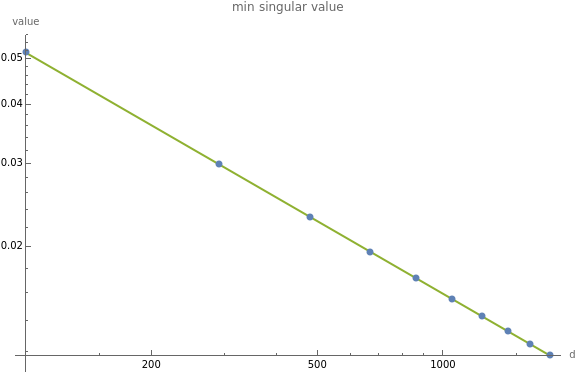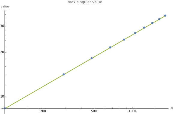 Clear["Global`*"];rowNormalize[dataset_]:=Normalize/@dataset;makeTriangularDataset[d_]:=rowNormalize@LowerTriangularize[ConstantArray[1.,{d,d}]];takeEvenly[vals_,numClusters_]:=Module[{cdfPoints,indices},(*Drop1,thelastendpoint*)cdfPoints=Most@Subdivide[0,1,numClusters];indices=Floor[Length[vals]*cdfPoints]+1;vals[[indices]]];powerLawFit[xvals_,yvals_]:=Module[{logData,linearFit,a,b,x},logData=Transpose[{Log[xvals],Log[yvals]}];linearFit=LinearModelFit[logData,x,x];{a,b}=linearFit["BestFitParameters"];fit=Exp[a+b*Log[x]];fitModel=Function@@{{x},fit};fitModel];dimsList=takeEvenly[Range[100,2000],10];minSvals=Min[SingularValueList[makeTriangularDataset[#]]]&/@dimsList;maxSvals=Max[SingularValueList[makeTriangularDataset[#]]]&/@dimsList;sf={"Log","Log"};yvals=minSvals;combinedPlot[yvals_,plotLabel_]:=(observedPlot=ListPlot[{dimsList,yvals},ScalingFunctions->sf];f=powerLawFit[dimsList,yvals];fittedPlot=Plot[{None,None,f[t]},{t,Min[dimsList],Max[dimsList]},PlotLegends->{None,None,f[t]},ScalingFunctions->sf,PlotRange->All];Show[fittedPlot,observedPlot,ImageSize->Large,AxesLabel->{"d","value"},PlotRange->All,PlotLabel->plotLabel,ScalingFunctions->sf]);combinedPlot[minSvals,"min singular value"]combinedPlot[maxSvals,"max singular value"]
