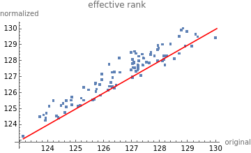 (*normalizematrixsothatithas1'sondiagonal*)normalizeDiag[mat_]:=Module[{},factors=DiagonalMatrix[1/Diagonal@mat];Sqrt[factors].mat.Sqrt[factors]];(*normalizematrixtohavetrace1*)traceNormalize[mat_]:=mat/Tr[mat];n=500;nMats=100;randMat:=RandomVariate[NormalDistribution[],{n,n}];randCov:=With[{m=RandomVariate[NormalDistribution[],{n,n}]},m.m];A=randMat;mat=A.Transpose[A];rank[m_]:=;data={rank[#],rank[normalizeDiag[#]]}&/@Table[randCov,nMats];plot1=ListPlot[data,AxesLabel{"original","normalized"},PlotLabel"effective rank"];plot2=Plot[x,{x,Min[data],Max[data]},PlotStyleRed];Show[plot1,plot2]