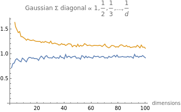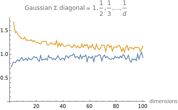(*scalenumbersampleswithd*)getVals[d_,b_]:=(numSamples=1000*d;With[{h=Table[i^-1.,{i,1,d}]},initialize[h/Total[h]];];oneOverE=1/expectation[innerProductSquared,b];EoneOver=expectation[1/innerProductSquared[#]&,b];{oneOverE,EoneOver});vals=Table[getVals[d,1],{d,10,1000,10}];ListLinePlotvals,AxesLabel->{"dimensions"},PlotLegends->{"FractionBox[\(1\), \(E[\(||\)\(x\)\*SuperscriptBox[\(||\), \(4\)]]\)]","EFractionBox[\(1\), \(\(||\)\(x\)\*SuperscriptBox[\(||\), \(4\)]\)]"},PlotLabel->"Gaussian Σ diagonal ∝ 1,,,...,"
