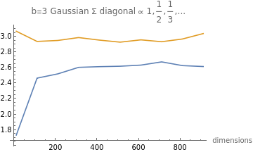 initialize[h0_]:=(d=Length[h0];h=h0;sampler=gaussianSampler[h];sigma=DiagonalMatrix[h];);gaussianSampler[diag_]:=With[{d=Length[diag]},Compile[{{n,_Integer}},Module[{vals},vals=Sqrt[diag]*#&/@RandomVariate[NormalDistribution[],{n,d}]]]];(*estimatesaveragevalueoffunconsamplesizes*)expectation[func_,s_]:=With[{numBatches=Max[1,Floor[Sqrt[s]*numSamples/(s*d)]]},Nest[func[sampler@s]+#&,0.,numBatches]/numBatches];cosineSimilaritySquared=Compile[{{X,_Real,2}},Module[{b=Length[X],meanLengthSquared,X2,gram},meanLengthSquared=Total[Total[#.#]&/@X]/b;X2=#/Norm[#]&/@X;gram=X2.X2;Total@Flatten@(gram*gram)/b/b]];innerProductSquared=Compile[{{X,_Real,2}},Module[{b=Length[X],meanLengthSquared,gram},gram=X.X;Total@Flatten@(gram*gram)/b/b]];getVals[d_,b_]:=(With[{h=Table[i^-1.,{i,1,d}]},initialize[h/Total[h]];];oneOverE=1/expectation[innerProductSquared,b];EoneOver=expectation[1/innerProductSquared[#]&,b];{oneOverE,EoneOver})numSamples=1000000;b=3;dims=Table[d,{d,10,1000,100}];vals=Table[getVals[d,b],{d,dims}];vals=Thread[{dims,#}]&/@{vals[[1]],vals[[2]]};ListLinePlotvals,AxesLabel->{"dimensions"},PlotLegends->{"FractionBox[\(1\), \(E[\(\(<\)\(x\)\), \(\(y\)\*SuperscriptBox[\(>\), \(2\)]\)]\)]","EFractionBox[\(1\), \(\(\(<\)\(x\)\), \(\(y\)\*SuperscriptBox[\(>\), \(2\)]\)\)]"},PlotLabel->StringForm"b=`` Gaussian Σ diagonal ∝ 1,,,...",b